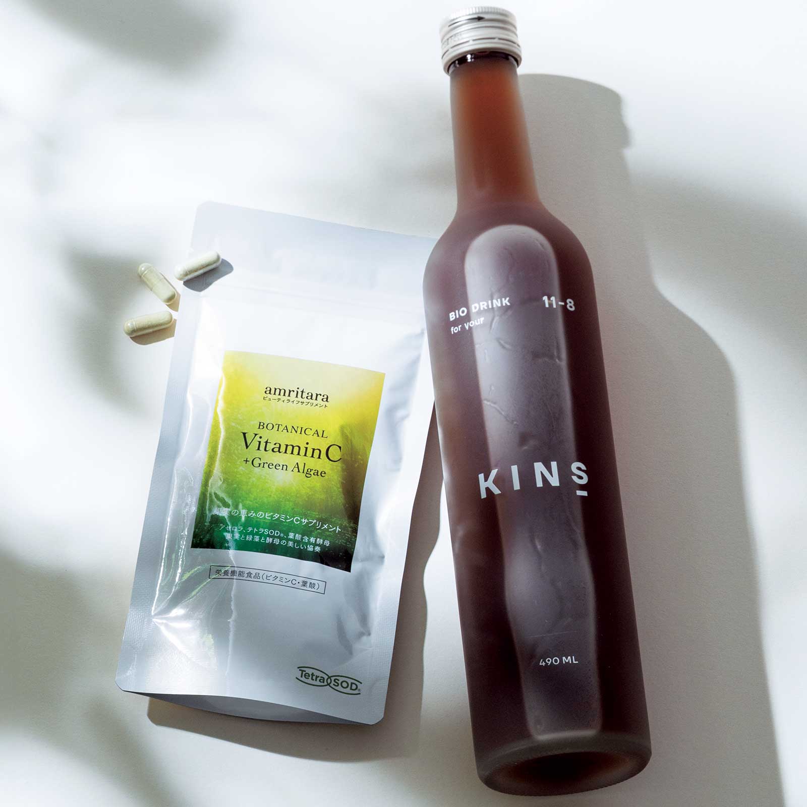 スキンケアを見直しても不調が続くなら、サプリにも注目。ビタミンCや乳酸菌を摂って、肌を土台から立て直すことから始めましょう。左:【ビタミンC】ポリフェノールやアントシアニンなども含むアセロラからビタミンCを摂取。ボタニカル ビタミンC+グリーンアルジー 90粒 ¥3,996(AMRITARA)右:【乳酸菌】乳酸菌ほか効率的に菌ケアが叶う多彩な栄養素が凝縮。BIO DRINK 490ml ¥6,480(KINS)