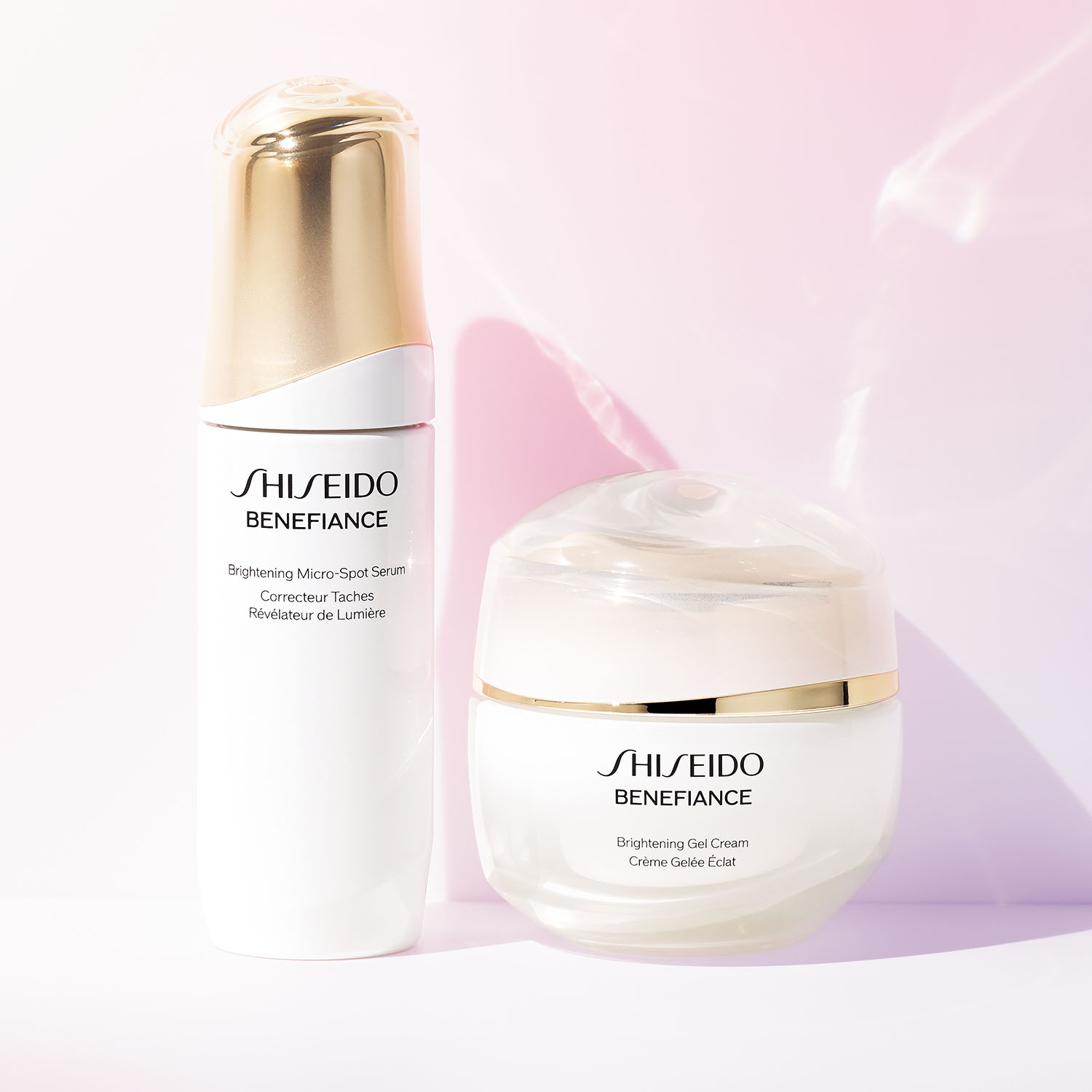 美白有効成分アクティブ4MSKが肌内部に滞ることなく浸透するセラムとクリーム。肌にメラニンが溜まる前にアプローチし、シミやそばかすを抑制。乾燥小ジワを目立たなくする効果も。左:SHISEIDO ベネフィアンス ブライトニング マイクロS セラム[医薬部外品]50ml ¥19,250、右:同 ブライトニング ジェル クリーム[医薬部外品]50g ¥10,450(ともにSHISEIDO)