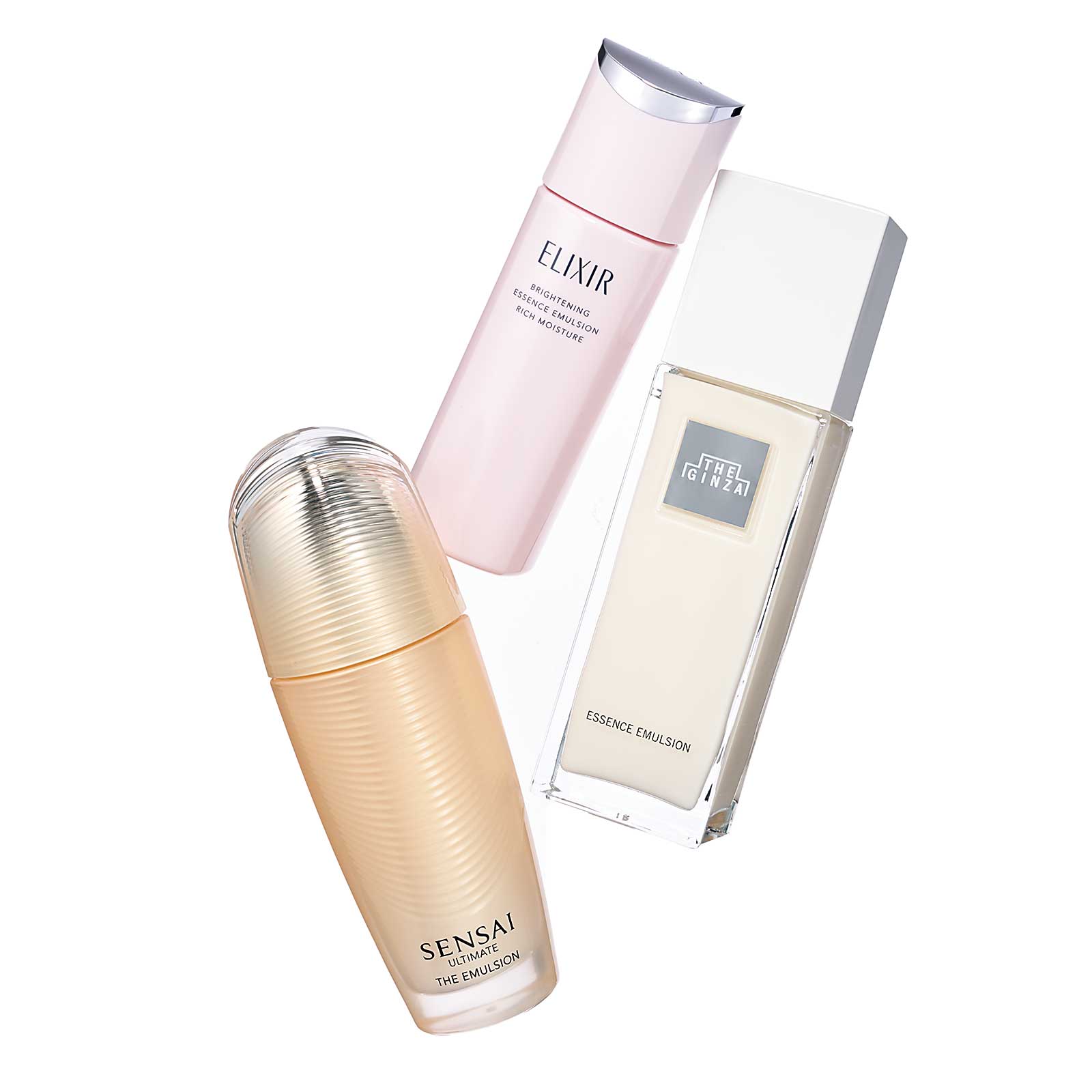 (左から)シルクを纏ったように、なめらかな膜で肌を包み込む。センサイ UTM ジ エマルジョン N 100ml ¥45,100(カネボウ化粧品)ハリ保湿成分コラジェネシスを配合したまろやかな乳液。ゆらぎ肌に嬉しいアルコールフリー処方。ブライトニング エマルジョン しっとりタイプ ca[医薬部外品]130ml ¥4,400※2/21発売(エリクシール)体温でとろけて角層深くまで浸透。肌表面に薄いうるおいヴェールを作る。ザ・ギンザ エッセンスエマルジョン n 150ml ¥24,200 (ザ・ギンザ)