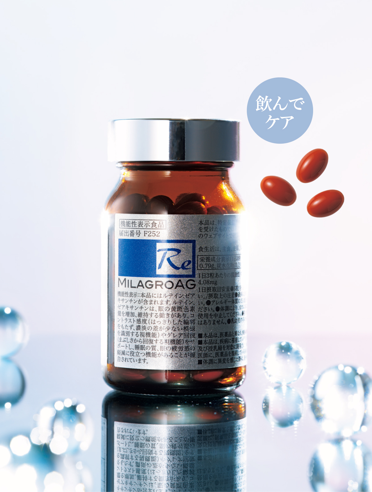 ありがとうございます(笑)。アイケアについては特別なことはほぼしていなくて、疲れた時などにホットタオルを目元に載せて血流とか巡りを良くしようと意識するくらい。あとはミラグロAGをきちんと毎日飲むことですね。インナーケアってつい忘れがちなんですが、ミラグロAGは好きなタイミングで1日1回飲めば良いから継続しやすいんです。