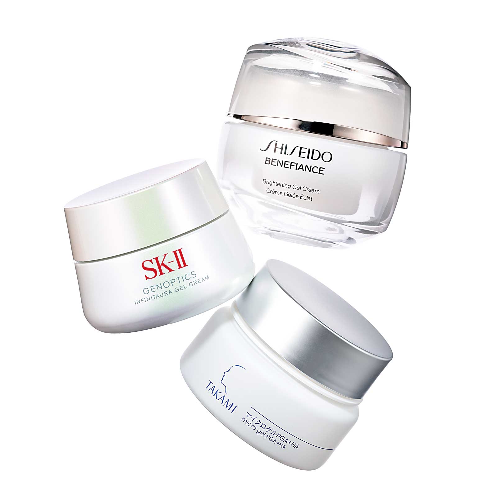 (上から)ふんわり軽いテクスチャー。美白有効成分4MSKをすみずみまで行き渡らせてクリアな肌に。ベネフィアンス ブライトニング ジェル クリーム[医薬部外品]50g ¥10,450(SHISEIDO)健やかな肌のpHに近い弱酸性。柔らかく広がり、うるおいで包み込む。ジェノプティクス インフィニットオーラ ジェルクリーム 50g ¥21,890〈編集部調べ〉※4/5発売(SK-II)水感たっぷりのオイルフリーゲル。うるおいを与えながら皮脂をコントロール。タカミマイクロゲルPGA+HA 50g ¥4,620※2/24発売(タカミ)