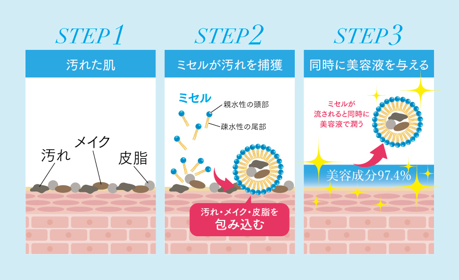 毛穴汚れを落とした瞬間に間髪入れず美容成分を入れ込む、ミセラー技術にこだわった賜物です。