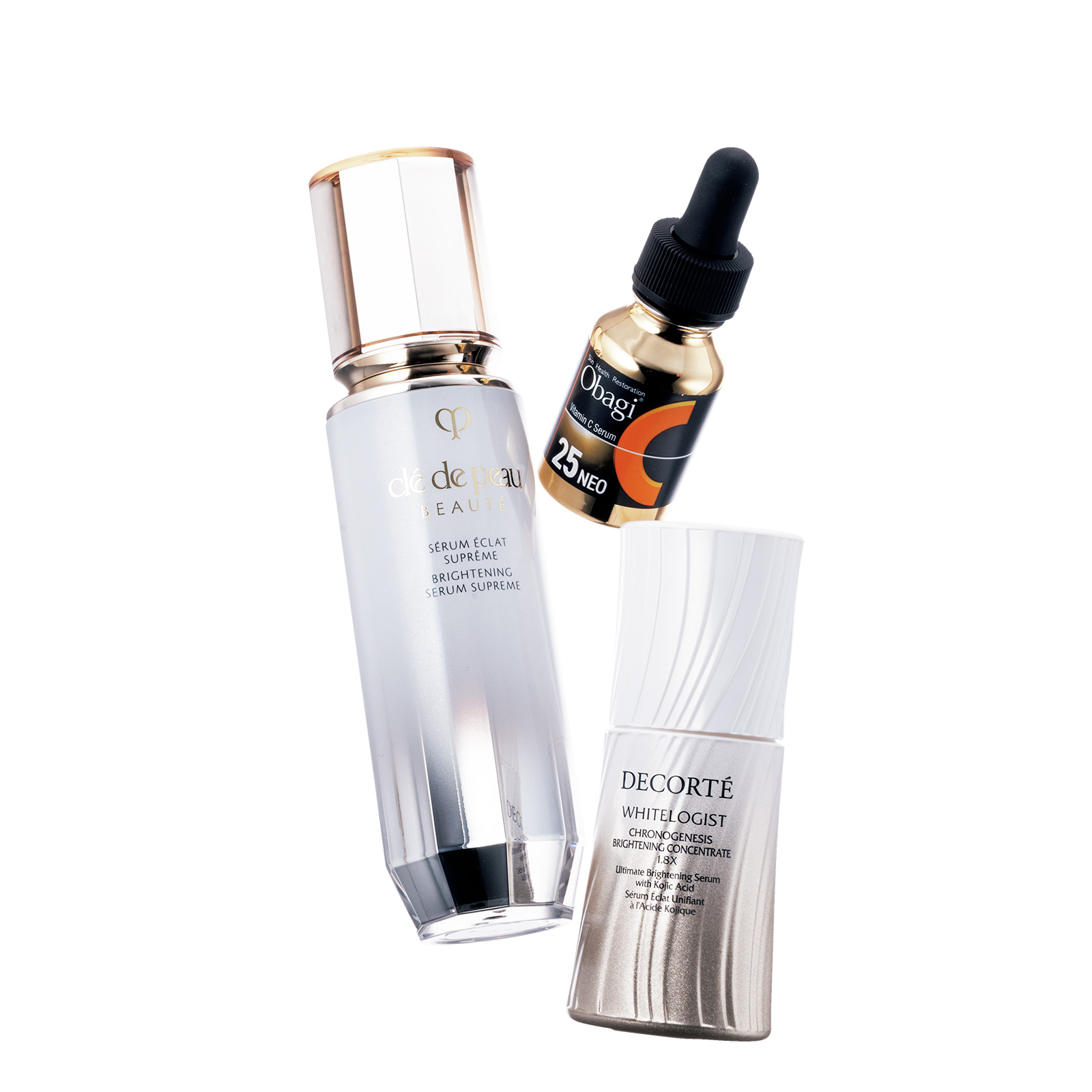 左から:セラムエクラS Ⅱ[医薬部外品]40ml ¥41,800 ※2/21発売〈編集部調べ〉(クレ・ド・ポー ボーテ)オバジC25セラム NEO 12ml ¥11,000(ロート製薬)ホワイトロジスト クロノジェネシス ブライトニング コンセントレイト 1.8X[医薬部外品]30ml ¥19,800(コスメデコルテ)