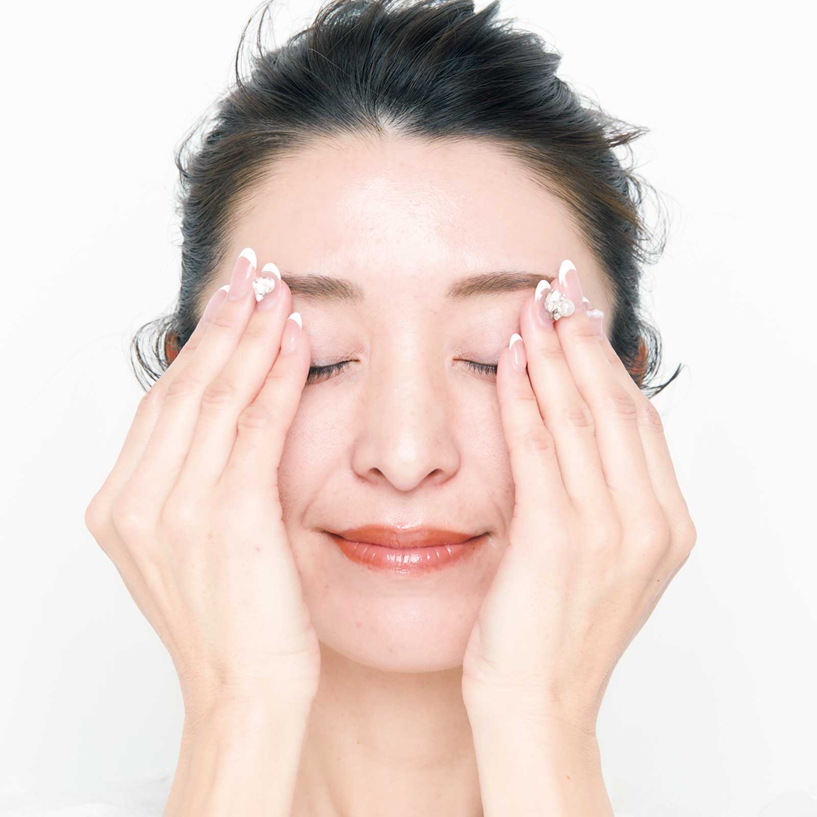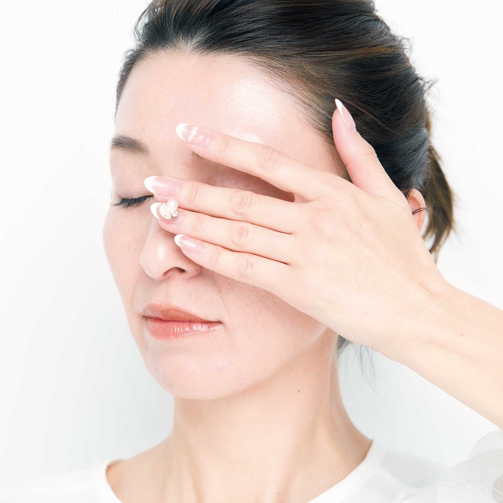 指で作ったカーブでクレンジングを馴染ませた目元を温めるようにそっと押さえます。押し付けずフィットさせるように。