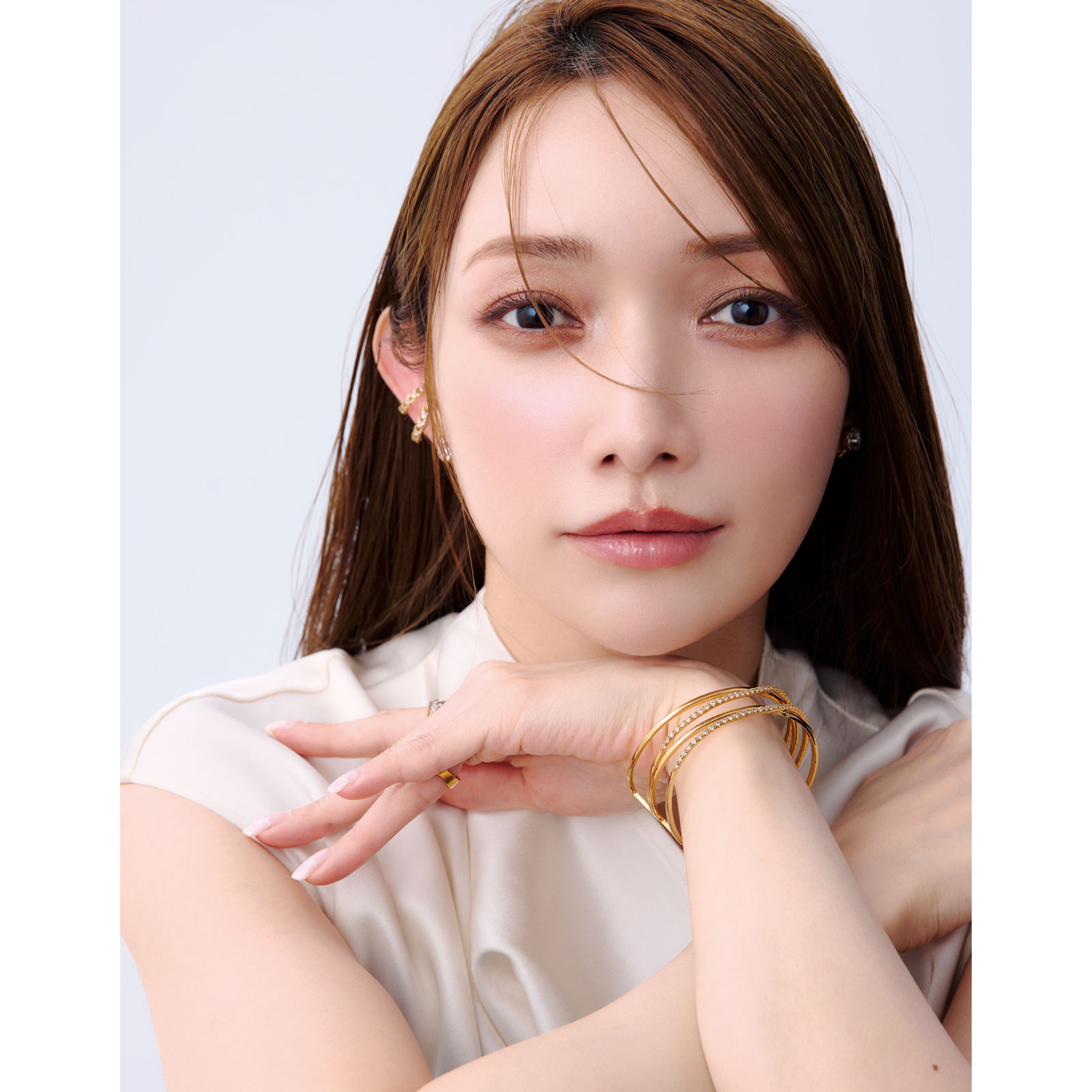 〈衣装クレジット〉ブラウス¥10,989(ドゥクラッセ)イヤリング¥9,900イヤカフ¥8,800リング[人指し指]¥37,800[薬指]¥24,300バングル¥21,600(すべてアビステ)